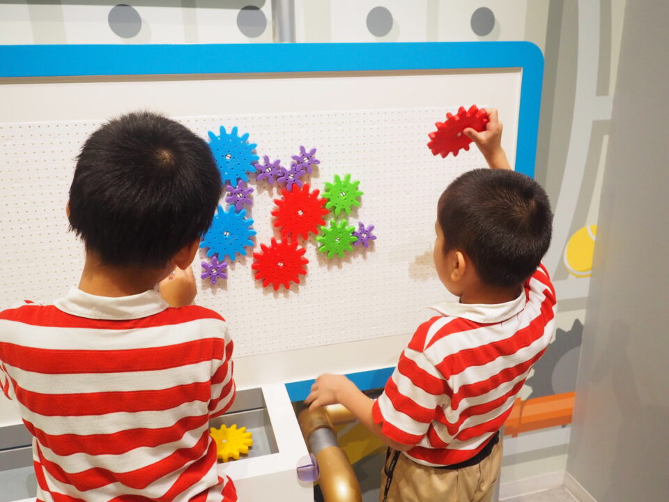 ”ぐるぐる歯車”では様々な大きさの歯車を組み合わせ、すべての歯車を一斉に回せるように考えながら歯車を組み合わせていました⚙️